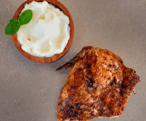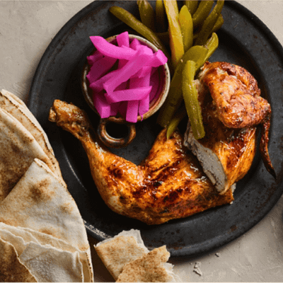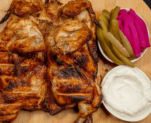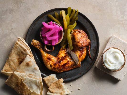 Half chicken, garlic, pickles and bread. Our Favourite!
