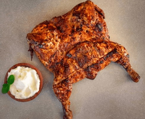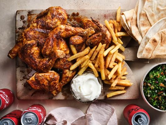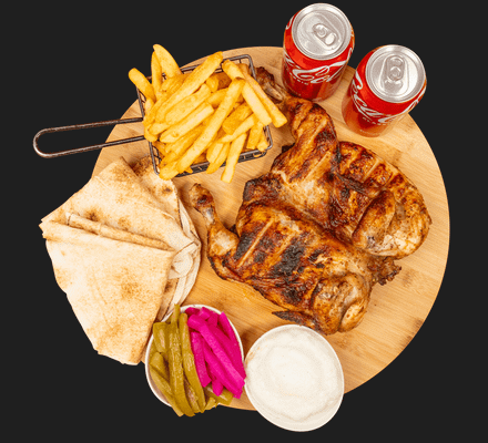 Two whole chicken, large garlic, large chips, choice of large salad -(pickle's, Tabouli or Coleslaw), bread and 4 cans of drink