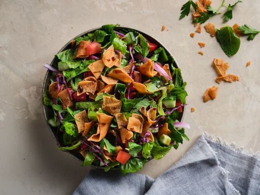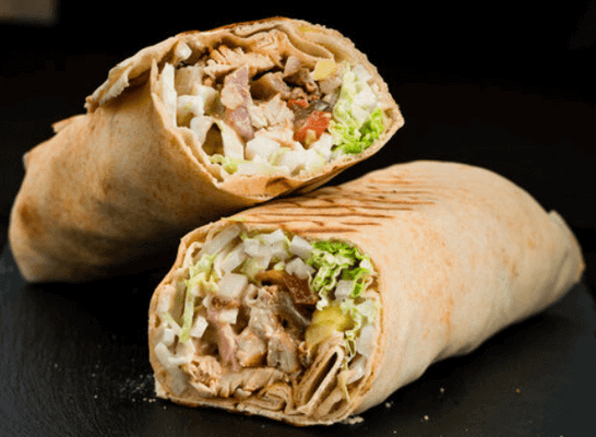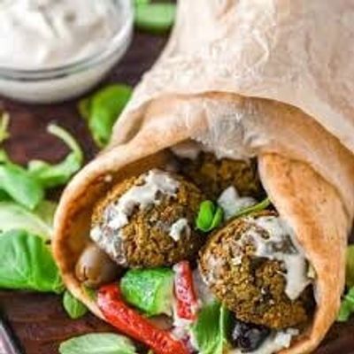 Falafal wrapped in a labenese bread with garlic sauce, lettuce, tomato, onion, mix pickles and tahini sauce