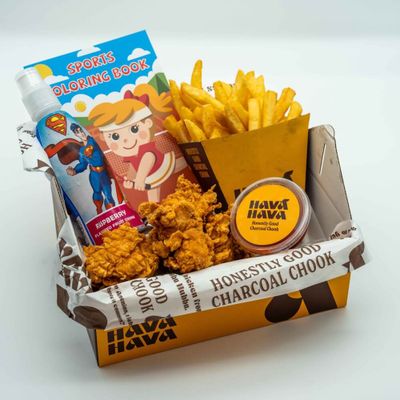 Regular size bites, small chips, tomato sauce, kid’s juice and kid’s activity pack